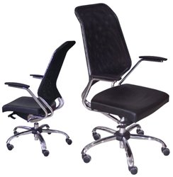 Com estrutura cromada, ergonômica, assento/encosto estofados em espuma injetada revestido em tecido ou curvim, braços fixos (acompanha modelo), base arcada em aço cromado com 05 rodízios.