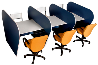 Mesas e laterais com tampo em melaminico com acabamento em filete, laterais modelo orelha de elefante curvo, estrutura painel.