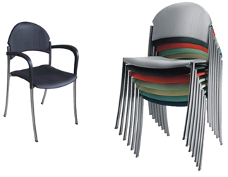 Assento/Encosto em PP, podendo ser acompanhado de espuma revestida em tecido, estrutura pé/braço ou sem braço.