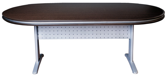Mesa oval com tampo em melaminico 68mm, acabamento com perfil gota em todo contorno, painel em chapa de aço perfurada, pés em base em chapa de aço repuxada, sem ponteira, coluna medindo 150mm, com calhas de saque lateral, pintura epóxi texturizada.