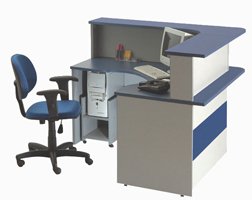 Tampo fabricado em melaminico, acabamento em filete em todo contorno, painel em melaminico, acabamento em filete, pé Central em chapa de aço com calha de saque frontal com 03 furos para passagem de fiação, pintura epóxi pó texturizada.