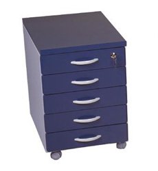 Gaveteiro em aço com 05 gavetas com chaves e puxadores em PVC e rodízios.