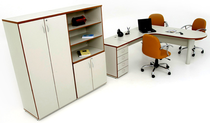 Armário diretor fechado e armário executivo aberto com tampo em melaminico filetados em todo contorno, portas e corpo em melaminico filetado, puxadores em pvc, porta direita com chave e trava simultânea das portas, base retangular fechada.